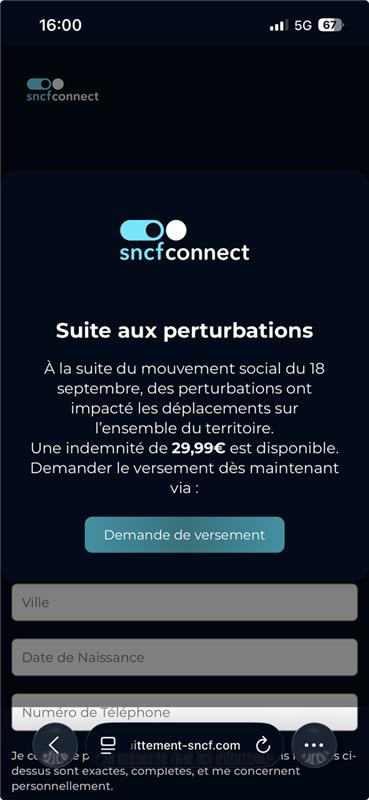 SNCF Connect non ti chiederà mai di fornire i tuoi dati personali (nome e cognome, età, indirizzo, coordinate bancarie, password, informazioni sull’account cliente, ecc.), né via e-mail né per SMS.