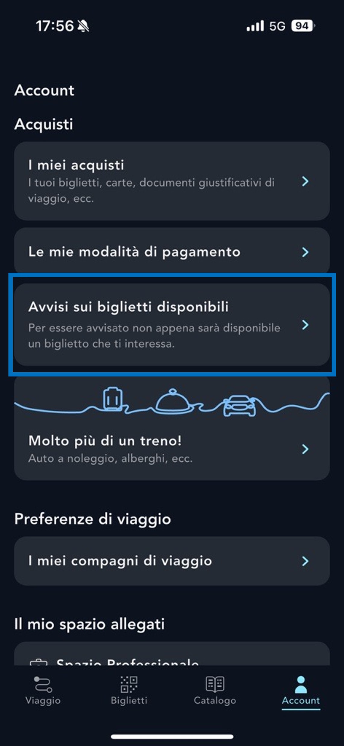 Vai alla sezione “Account”, clicca sulla scheda “Avvisi biglietti disponibili” e poi su “Avvisi di prenotazione”. Inserisci quindi il tuo itinerario e la data del viaggio e scegli i treni che ti interessano.