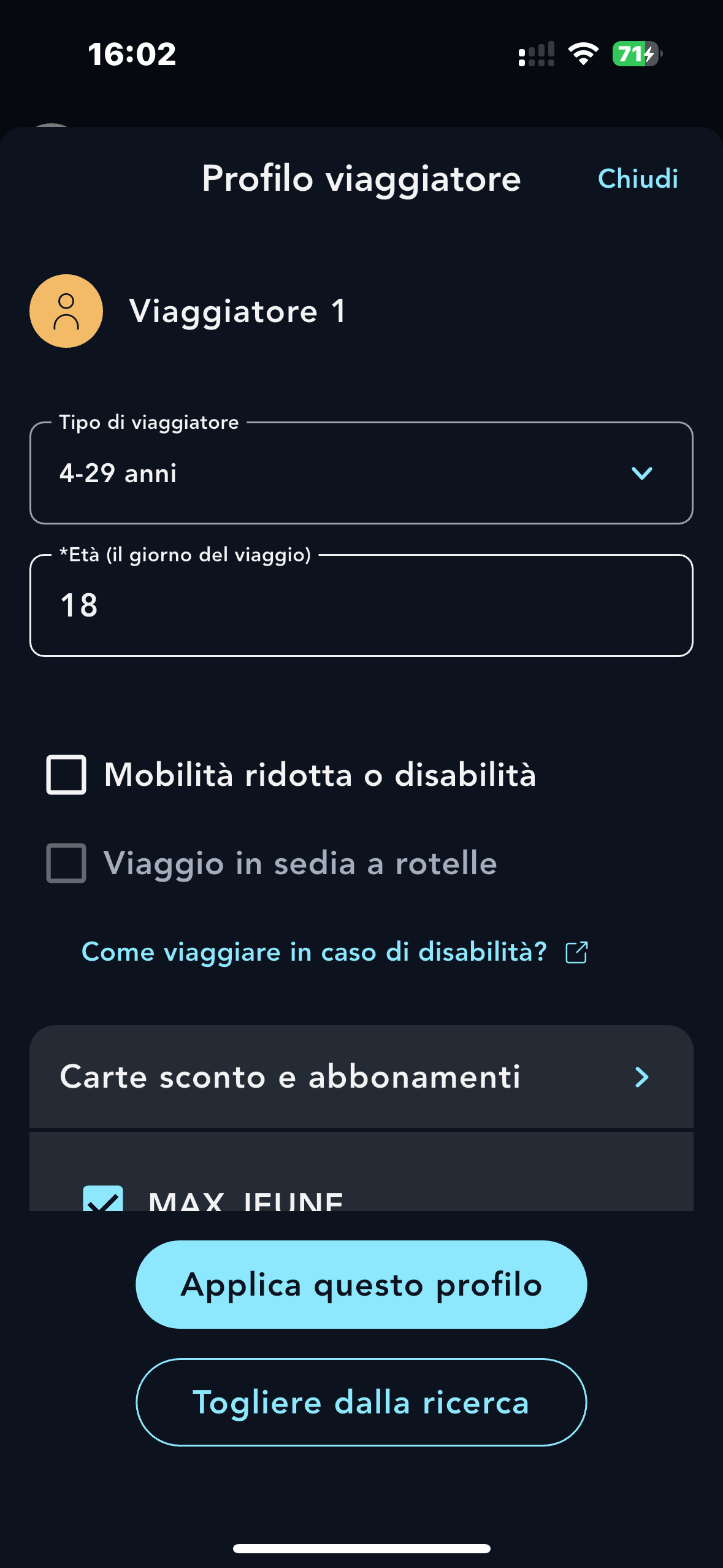 Seleziona la fascia d'età (4-29 anni) nel menu Passeggero 1, quindi indica la tua età e l'abbonamento MAX JEUNE corrispondente.