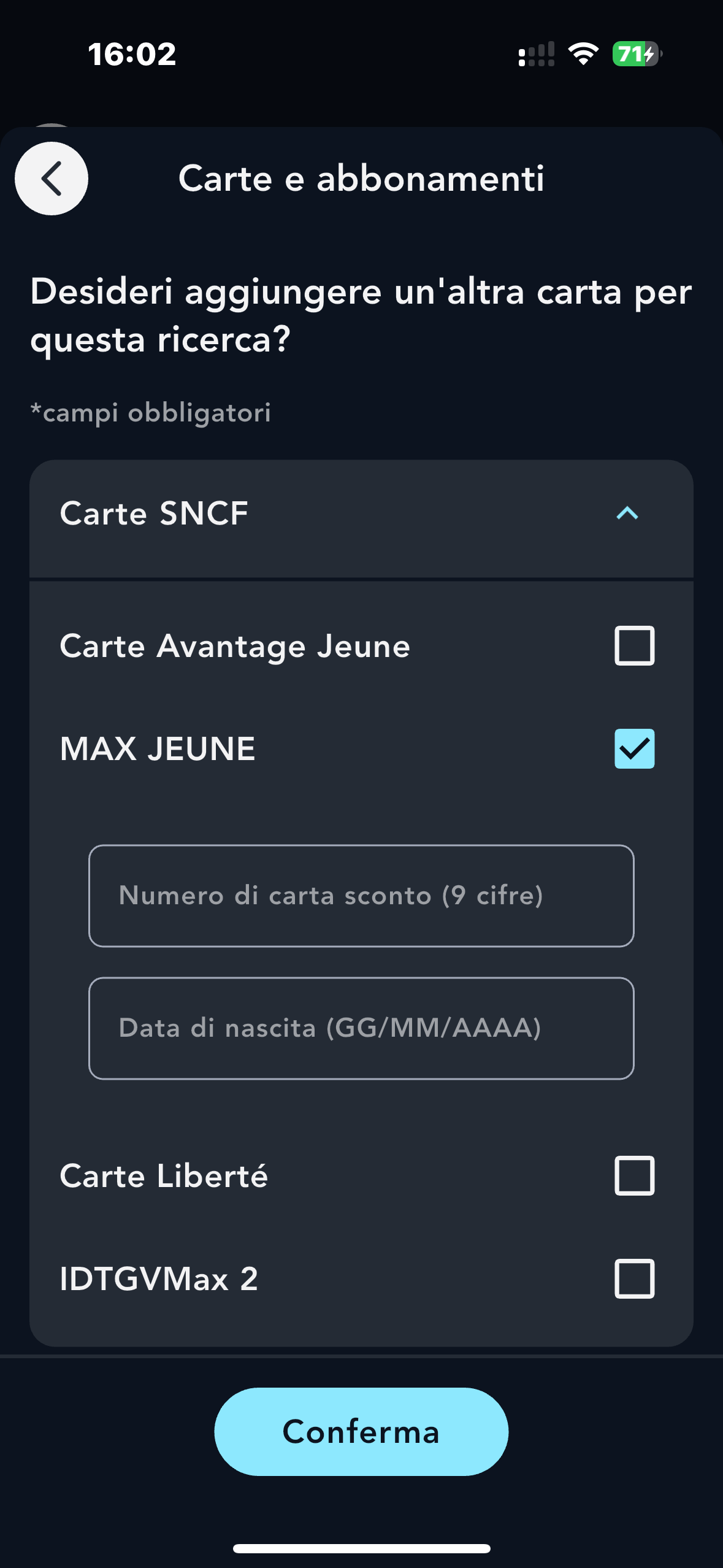 Conferma il tuo itinerario nella tua area MAX JEUNE entro 17 ore dal viaggio. Senza la tua conferma, le prenotazioni verranno annullate automaticamente.