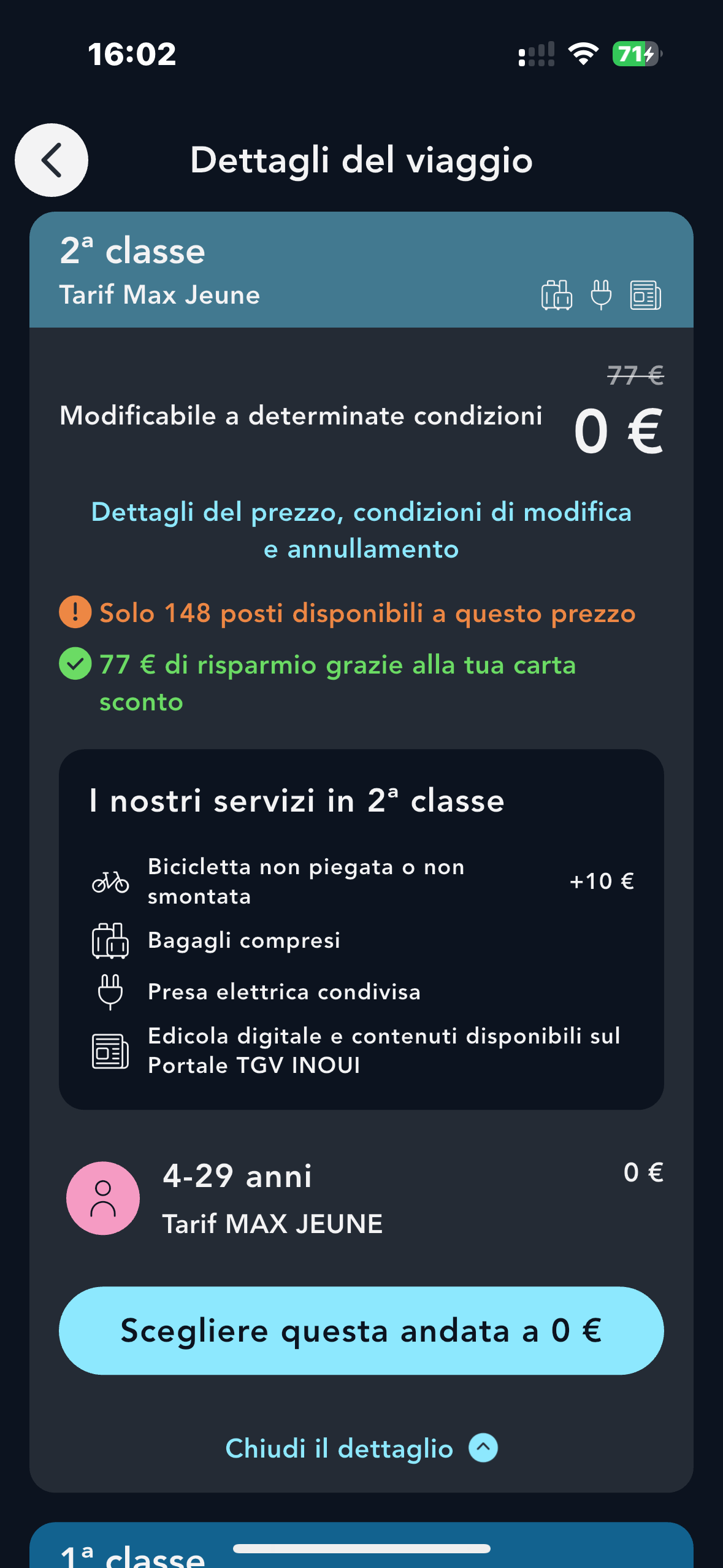 La tariffa MAX JEUNE a 0 € non è modificabile e ti permette di annullare il biglietto senza alcun costo fino alla partenza del treno.